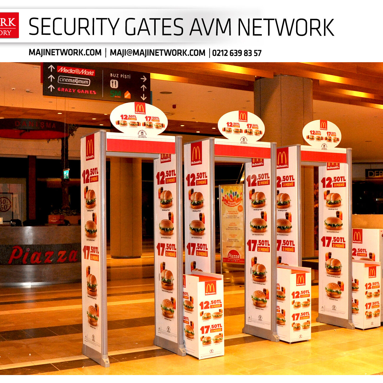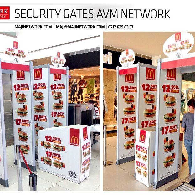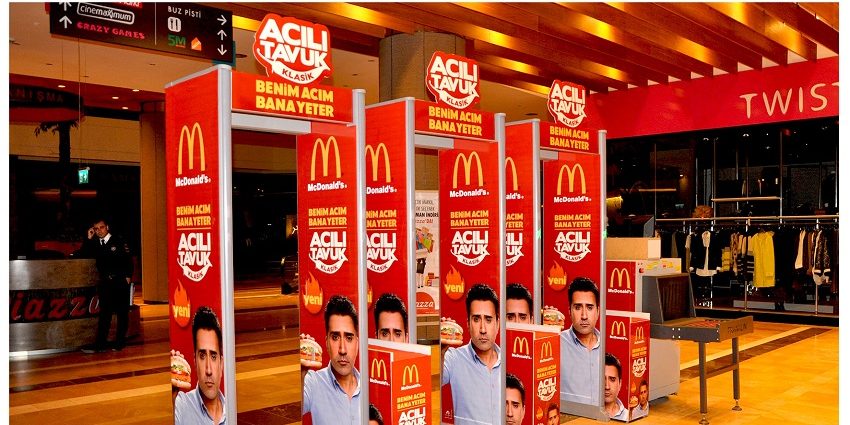 Mc Donald’s, Alisveris Merkezleri girişlerinde yer alan Security Gates projesiyle güvenlik kapılarında yer alan reklam alanlarında, şarkıcı Emrah ile lanse edilen acılı hamburgerini tanıtmaktadır.